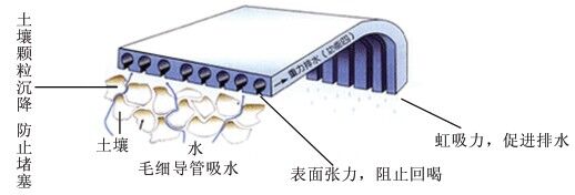 4.毛細(xì)式吸水相比傳統(tǒng)重力式排水不會(huì)產(chǎn)生較大的水土擾動(dòng)現(xiàn)象,可保持土壤長(zhǎng)期穩(wěn)定,不造成土壤流失和排水系統(tǒng)堵塞。